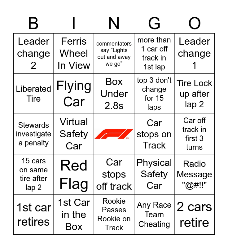 This bingo card has a free space and 29 words: 1st car retires, Exactly 6 Teams in top 10, Virtual Safety Car, Bad pit over 4 sec., Leader change 2, commentators say "Lights out and away we go", Flying Car, Red Flag, Car stops on Track, 1st Car in the Box, Car off track in first 3 turns, 2 cars retire, Rookie Passes Rookie on Track, Any Race Team Cheating, Tire Lock up after lap 2, Nose Job in the Box, Car stops off track, 15 cars on same tire after lap 2, Leader change 1, Stewards investigate a penalty, Physical Safety Car, Yellow Flag, top 3 don't change for 15 laps, Liberated Tire, more than 1 car off track in 1st lap, Ferris Wheel In View, Radio Message "@#!!", Box Under 2.8s and Carbon Pieces on the Track.