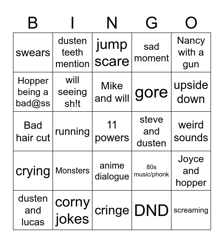 This bingo card has a free space and 24 words: Monsters, corny jokes, Mike and will, dusten and lucas, Nancy with a gun, swears, Hopper being a bad@ss, dusten teeth mention, steve and dusten, anime dialogue, gore, Bad hair cut, 80s music/phonk, Joyce and hopper, will seeing sh!t, DND, weird sounds, jump scare, upside down, running, screaming, crying, sad moment and cringe.