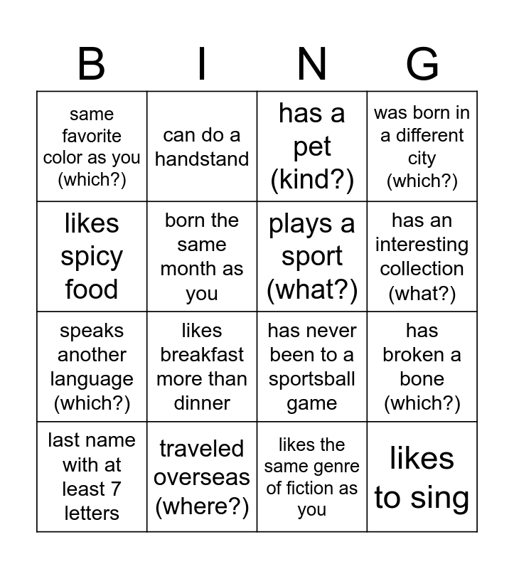 This bingo card has 16 words: traveled overseas (where?), has broken a bone (which?), has a pet (kind?), same favorite color as you (which?), speaks another language (which?), can do a handstand, has never been to a sportsball game, likes the same genre of fiction as you, likes spicy food, born the same month as you, last name with at least 7 letters, was born in a different city (which?), likes breakfast more than dinner, has an interesting collection (what?), plays a sport (what?) and likes to sing.