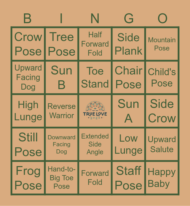 This bingo card has a free space and 24 words: Downward Facing Dog, Hand-to-Big Toe Pose, Toe Stand, Frog Pose, Mountain Pose, Crow Pose, Upward Facing Dog, Tree Pose, Sun A, Extended Side Angle, Chair Pose, High Lunge, Low Lunge, Upward Salute, Sun B, Staff Pose, Side Crow, Half Forward Fold, Child's Pose, Reverse Warrior, Happy Baby, Still Pose, Side Plank and Forward Fold.