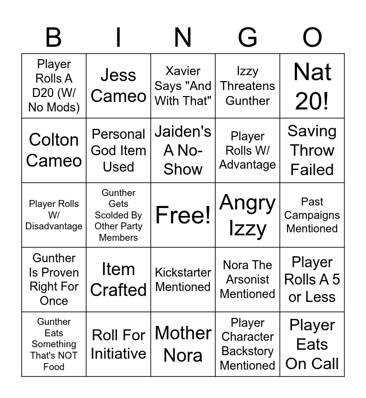 This bingo card has a free space and 24 words: Item Crafted, Roll For Initiative, Jaiden's A No-Show, Gunther Eats Something That's NOT Food, Nat 20!, Player Rolls A D20 (W/ No Mods), Colton Cameo, Jess Cameo, Angry Izzy, Kickstarter Mentioned, Player Rolls W/ Advantage, Player Rolls W/ Disadvantage, Nora The Arsonist Mentioned, Player Rolls A 5 or Less, Personal God Item Used, Player Character Backstory Mentioned, Past Campaigns Mentioned, Xavier Says "And With That", Saving Throw Failed, Gunther Gets Scolded By Other Party Members, Player Eats On Call, Gunther Is Proven Right For Once, Izzy Threatens Gunther and Mother Nora.