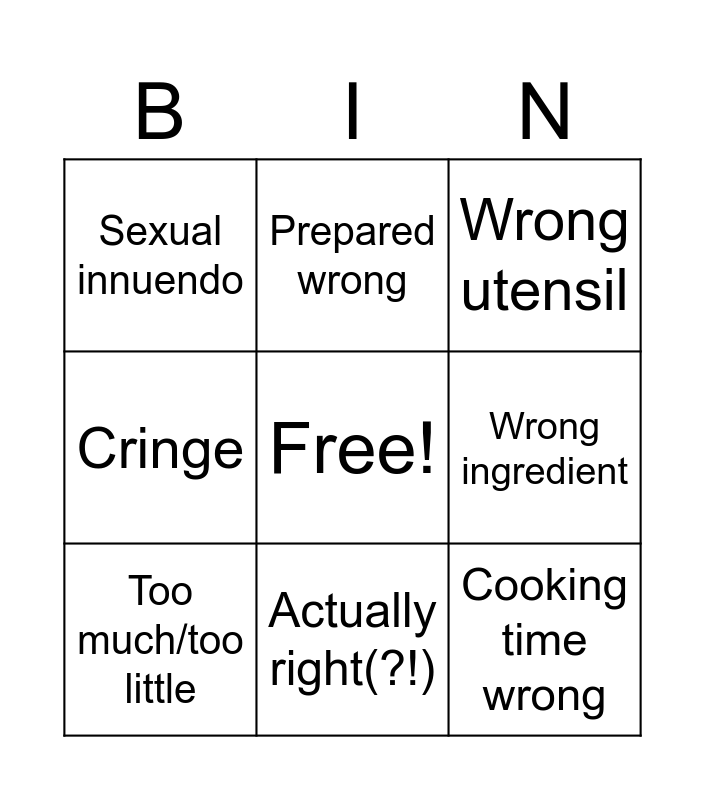 This bingo card has a free space and 8 words: Wrong ingredient, Wrong utensil, Prepared wrong, Too much/too little, Sexual innuendo, Cooking time wrong, Cringe and Actually right(?!).