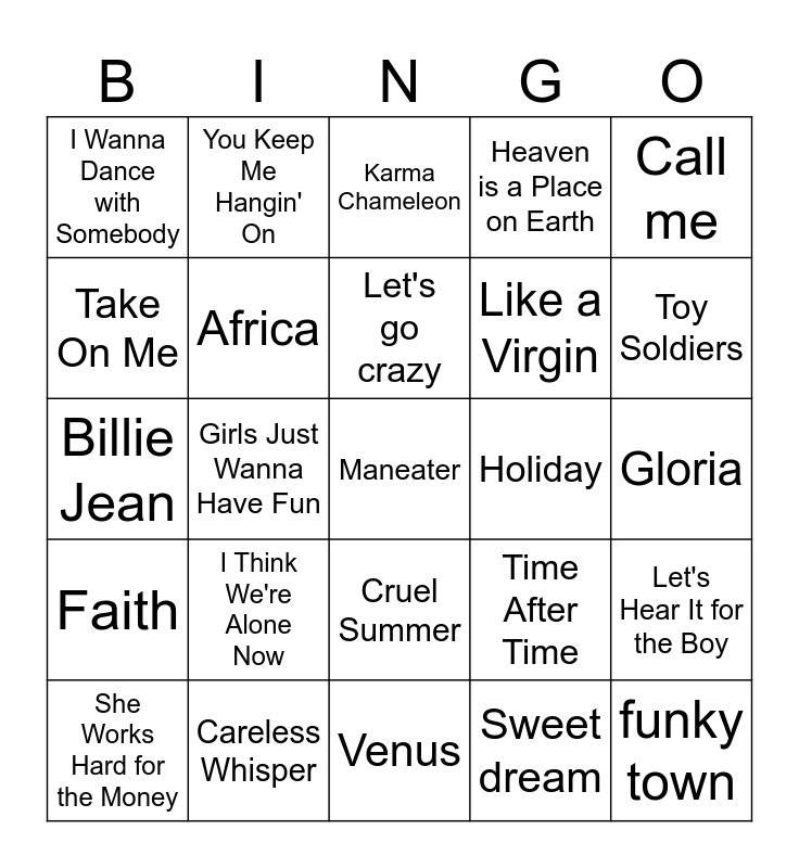 This bingo card has 40 words: Bette Davis Eyes, Billie Jean, Borderline, Africa, Careless Whisper, Cruel Summer, Let's go crazy, Flashdance... What a Feeling, Call me, Faith, Girls Just Wanna Have Fun, Heaven is a Place on Earth, Maneater, Gloria, Holiday, I Think We're Alone Now, Never gonna give you up, I Wanna Dance with Somebody, Jack and Diane, Karma Chameleon, Let's Hear It for the Boy, Sweet dream, Like a Virgin, Take On Me, Lucky Star, Manic Monday, Material Girl, Mickey, funky town, Physical, Rhythm of the Night, She Works Hard for the Money, Uptown girl, Time After Time, Toy Soldiers, Venus, Jessie's girl, Wake Me Up Before You Go-Go, You Keep Me Hangin' On and True Colors.
