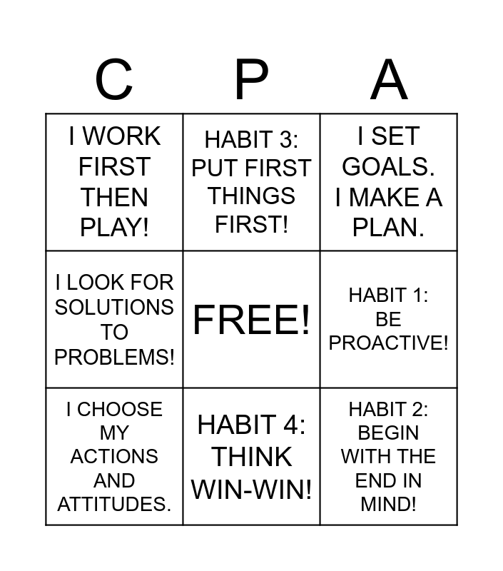 This bingo card has a free space and 8 words: HABIT 1: BE PROACTIVE!, I SET GOALS. I MAKE A PLAN., HABIT 3: PUT FIRST THINGS FIRST!, I CHOOSE MY ACTIONS AND ATTITUDES., I WORK FIRST THEN PLAY!, HABIT 2: BEGIN WITH THE END IN MIND!, I LOOK FOR SOLUTIONS TO PROBLEMS! and HABIT 4: THINK WIN-WIN!.