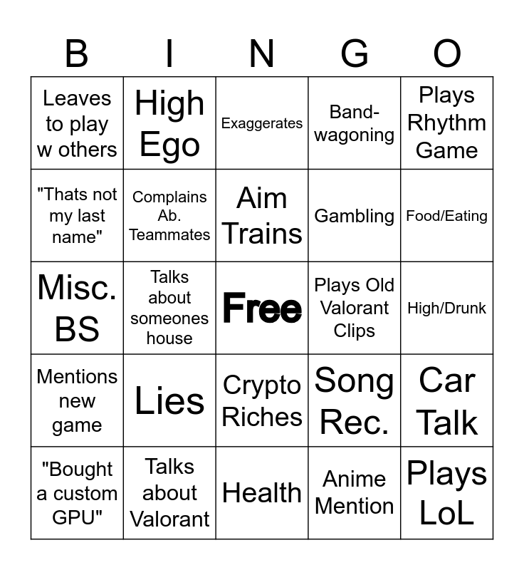 This bingo card has a free space and 24 words: Lies, Talks about Valorant, Aim Trains, "Bought a custom GPU", Plays Rhythm Game, Leaves to play w others, "Thats not my last name", High Ego, Plays Old Valorant Clips, Crypto Riches, Gambling, Misc. BS, Song Rec., Car Talk, Complains Ab. Teammates, Anime Mention, High/Drunk, Exaggerates, Food/Eating, Talks about someones house, Plays LoL, Mentions new game, Band- wagoning and Health.
