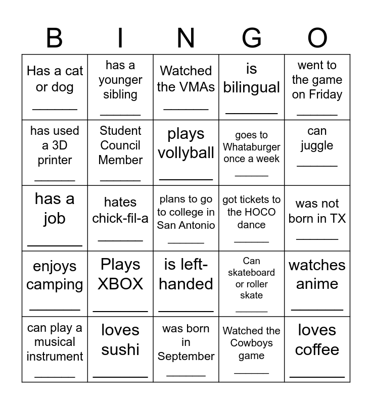 This bingo card has a free space and 24 words: Plays XBOX ______, loves sushi ______, plays vollyball ______, can play a musical instrument ______, went to the game on Friday ______, Has a cat or dog ______, has used a 3D printer ______, has a younger sibling ______, got tickets to the HOCO dance ______, is left-handed ______, goes to Whataburger once a week ______, has a job ______, Can skateboard or roller skate ______, watches anime ______, Student Council Member ______, Watched the Cowboys game ______, was not born in TX ______, Watched the VMAs ______, can juggle ______, hates chick-fil-a ______, loves coffee ______, enjoys camping ______, is bilingual ______ and was born in September ______.