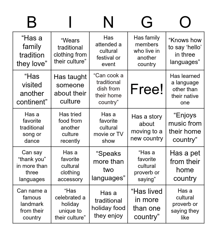 This bingo card has 26 words: “Speaks more than two languages”, “Has lived in more than one country”, “Can cook a traditional dish from their home country”, “Has celebrated a holiday unique to their culture”, “Knows how to say ‘hello’ in three languages”, “Has a family tradition they love”, “Has visited another continent”, “Wears traditional clothing from their culture”, “Enjoys music from their home country”, “Has a favorite cultural proverb or saying”, Free!, Has a favorite traditional song or dance, Has a pet from their home country, Can name a famous landmark from their country, Has tried food from another culture recently, Has a unique hobby or pastime from their culture, Has family members who live in another country, Can say “thank you” in more than three languages, Has attended a cultural festival or event, Has a favorite cultural movie or TV show, Has learned a language other than their native one, Has a traditional holiday food they enjoy, Has a story about moving to a new country, Has a favorite cultural clothing accessory, Has taught someone about their culture and Has a cultural proverb or saying they like.