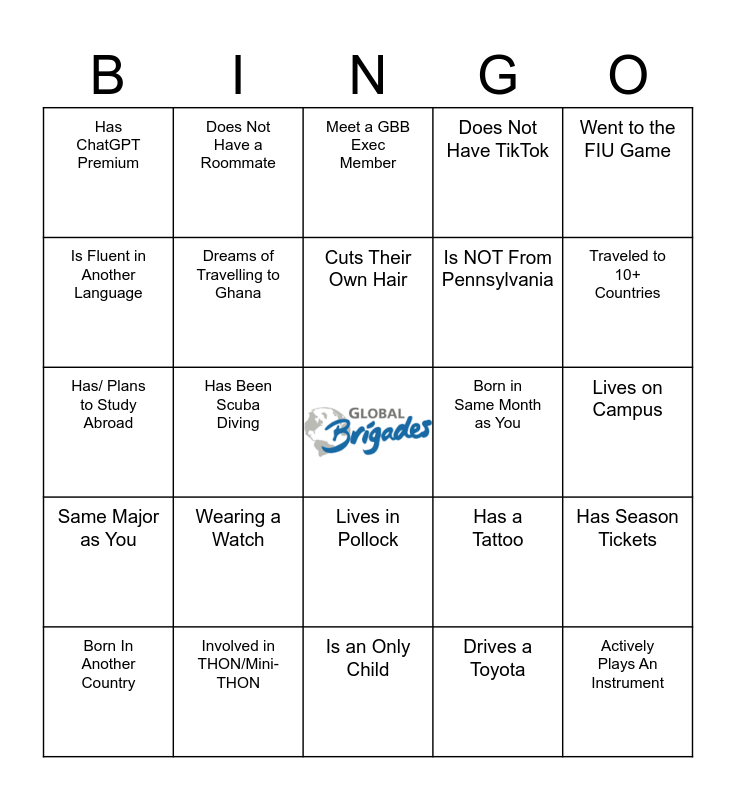 This bingo card has a free space and 24 words: Wearing a Watch, Involved in THON/Mini-THON, Cuts Their Own Hair, Born In Another Country, Went to the FIU Game, Has ChatGPT Premium, Is Fluent in Another Language, Does Not Have a Roommate, Born in Same Month as You, Lives in Pollock, Is NOT From Pennsylvania, Has/ Plans to Study Abroad, Has a Tattoo, Has Season Tickets, Dreams of Travelling to Ghana, Drives a Toyota, Lives on Campus, Meet a GBB Exec Member, Traveled to 10+ Countries, Has Been Scuba Diving, Actively Plays An Instrument, Same Major as You, Does Not Have TikTok and Is an Only Child.