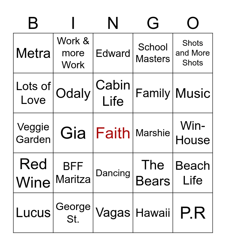 This bingo card has a free space and 29 words: Lucus, Logan, Gia, Janiah, Metra, Edward, Odaly, BFF Maritza, Marshie, George St., Win-House, P.R, Vagas, Hawaii, Music, Laughter, Dancing, Red Wine, Shots and More Shots, Veggie Garden, The Bears, Go Cubs, Family, Lots of Love, School Masters, Work & more Work, Beach Life, Cabin Life and 2025.