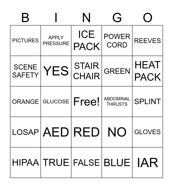 This bingo card has a free space and 24 words: AED, TRUE, STAIR CHAIR, HIPAA, REEVES, PICTURES, SCENE SAFETY, APPLY PRESSURE, ABDOMINAL THRUSTS, RED, GREEN, ORANGE, NO, GLOVES, YES, BLUE, SPLINT, ICE PACK, HEAT PACK, GLUCOSE, IAR, LOSAP, POWER CORD and FALSE.