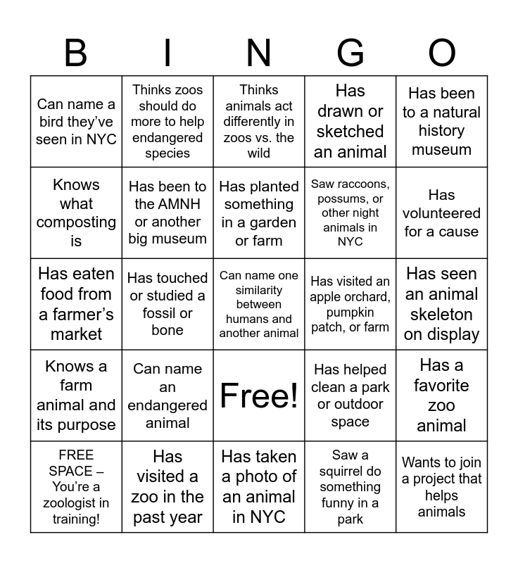 This bingo card has 26 words: Free!, Saw a squirrel do something funny in a park, Has planted something in a garden or farm, Has visited a zoo in the past year, Has been to a natural history museum, Can name a bird they’ve seen in NYC, Knows what composting is, Thinks zoos should do more to help endangered species, Has seen an animal skeleton on display, Has helped clean a park or outdoor space, Saw raccoons, possums, or other night animals in NYC, Has eaten food from a farmer’s market, Has a favorite zoo animal, FREE SPACE – You’re a zoologist in training!, Has touched or studied a fossil or bone, Knows what “citizen science” means, Has drawn or sketched an animal, Knows a farm animal and its purpose, Thinks animals act differently in zoos vs. the wild, Can name one similarity between humans and another animal, Has volunteered for a cause, Has taken a photo of an animal in NYC, Has visited an apple orchard, pumpkin patch, or farm, Can name an endangered animal, Has been to the AMNH or another big museum and Wants to join a project that helps animals.