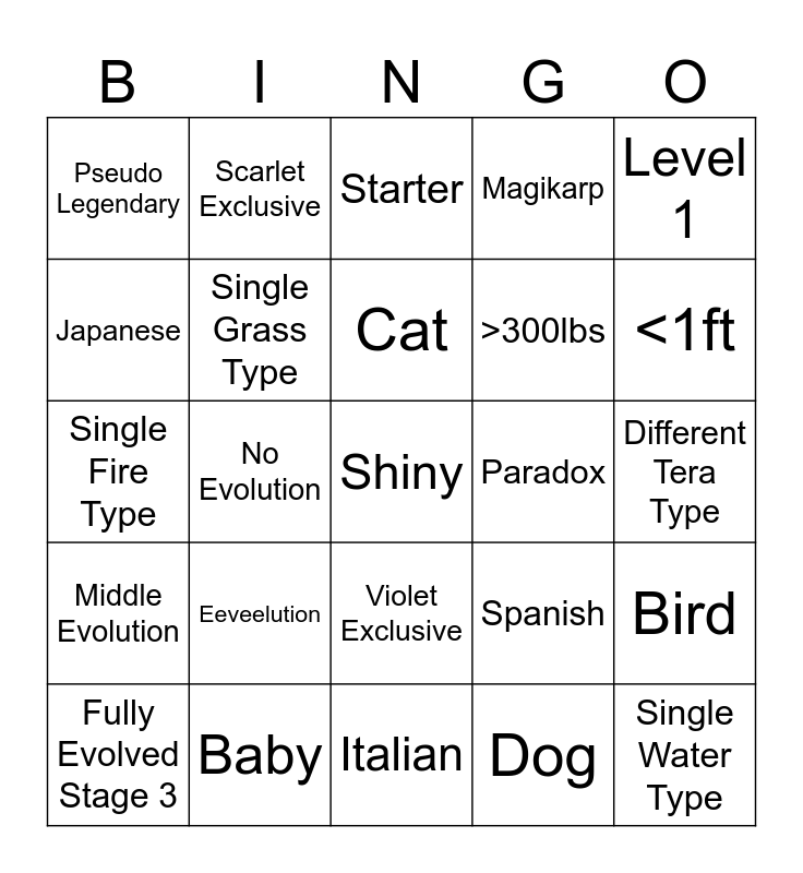 This bingo card has a free space and 24 words: Eeveelution, Baby, Cat, Fully Evolved Stage 3, Level 1, Pseudo Legendary, Japanese, Scarlet Exclusive, Paradox, Violet Exclusive, >300lbs, Single Fire Type, Spanish, Bird, Single Grass Type, Dog, Different Tera Type, Starter, <1ft, No Evolution, Single Water Type, Middle Evolution, Magikarp and Italian.