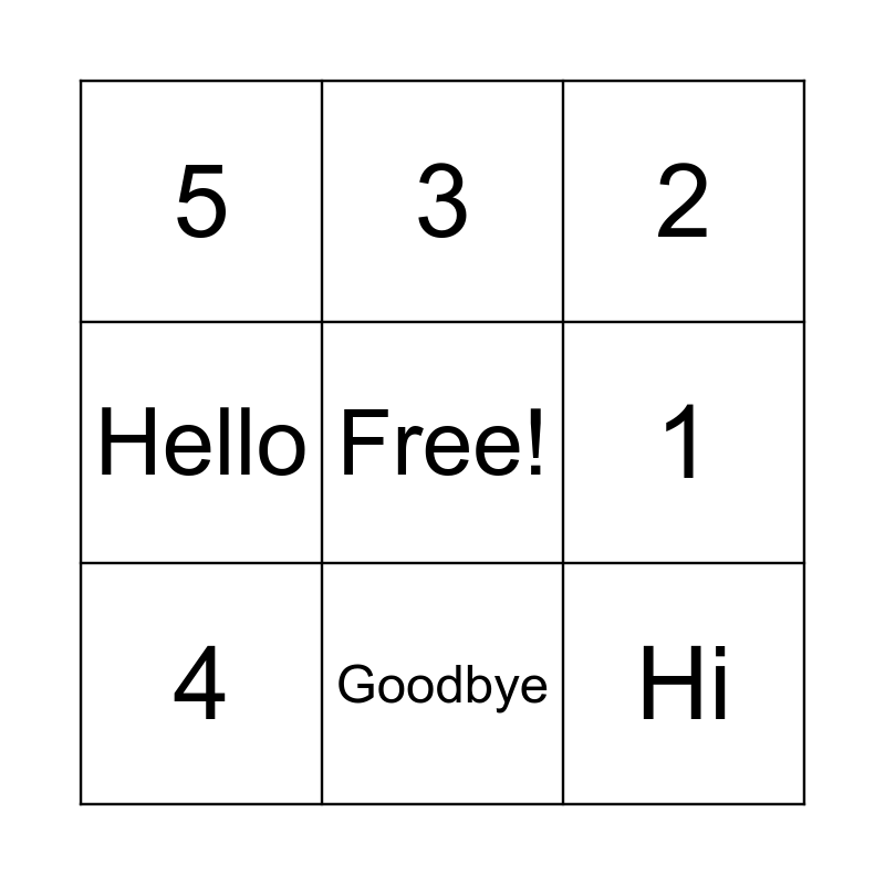 This bingo card has a free space and 8 words: 1, 2, 3, 4, 5, Hi, Hello and Goodbye.