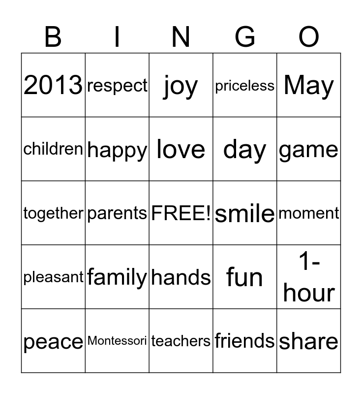 This bingo card has a free space and 24 words: family, Montessori, love, peace, May, 2013, children, respect, smile, hands, day, together, fun, 1-hour, happy, friends, moment, joy, game, parents, share, pleasant, priceless and teachers.
