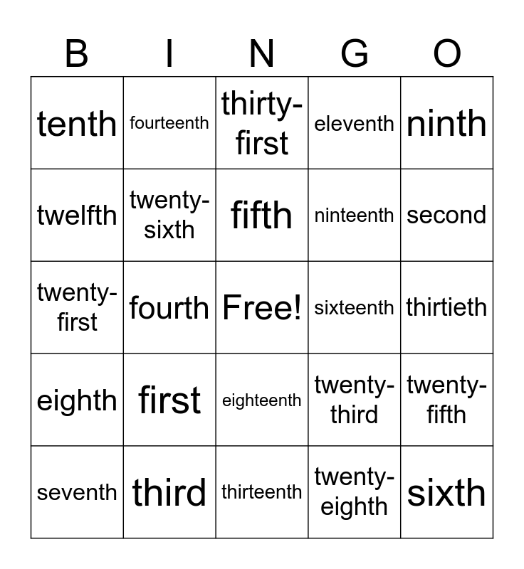 This bingo card has a free space and 24 words: first, third, fifth, seventh, ninth, tenth, twelfth, fourteenth, sixteenth, eighteenth, ninteenth, twenty-first, twenty-third, twenty-fifth, twenty-sixth, twenty-eighth, thirtieth, thirty-first, second, fourth, sixth, eighth, eleventh and thirteenth.