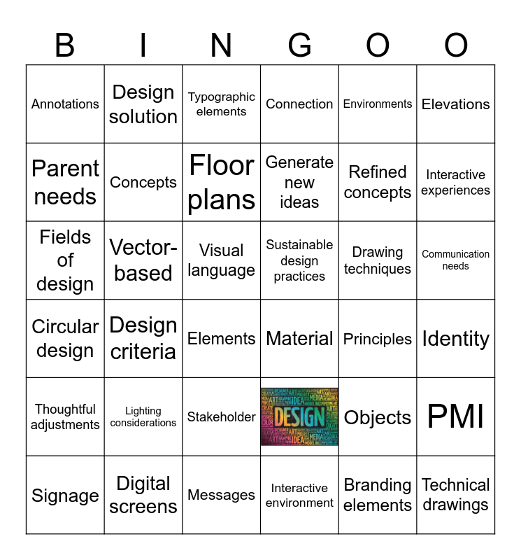 This bingo card has 1 images and 35 words: Stakeholder, Interactive environment, Parent needs, Circular design, Sustainable design practices, Concepts, Messages, Environments, Objects, Interactive experiences, Connection, PMI, Vector-based, Generate new ideas, Annotations, Thoughtful adjustments, Drawing techniques, Fields of design, Typographic elements, Visual language, Design criteria, Material, Elements, Principles, Design solution, Refined concepts, Digital screens, Floor plans, Elevations, Technical drawings, Signage, Identity, Communication needs, Lighting considerations and Branding elements.