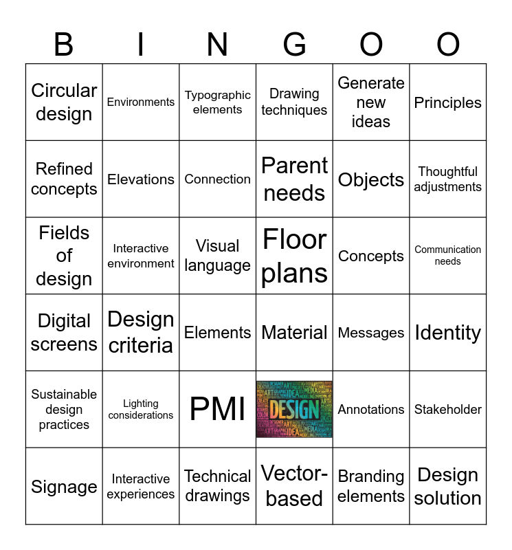 This bingo card has 1 images and 35 words: PMI, Vector-based, Refined concepts, Digital screens, Floor plans, Elevations, Technical drawings, Generate new ideas, Annotations, Thoughtful adjustments, Drawing techniques, Stakeholder, Interactive environment, Parent needs, Circular design, Sustainable design practices, Concepts, Fields of design, Typographic elements, Visual language, Design criteria, Material, Elements, Messages, Environments, Objects, Interactive experiences, Connection, Principles, Design solution, Signage, Identity, Communication needs, Lighting considerations and Branding elements.