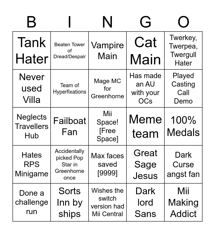 This bingo card has a free space and 24 words: Accidentally picked Pop Star in Greenhorne once, Sorts Inn by ships, Mage MC for Greenhorne, Done a challenge run, Twerkey, Twerpea, Twergull Hater, Tank Hater, Never used Villa, Beaten Tower of Dread/Despair, Meme team, Max faces saved [9999], Has made an AU with your OCs, Neglects Travellers Hub, Great Sage Jesus, Dark Curse angst fan, Team of Hyperfixations, Dark lord Sans, 100% Medals, Vampire Main, Played Casting Call Demo, Failboat Fan, Mii Making Addict, Hates RPS Minigame, Cat Main and Wishes the switch version had Mii Central.