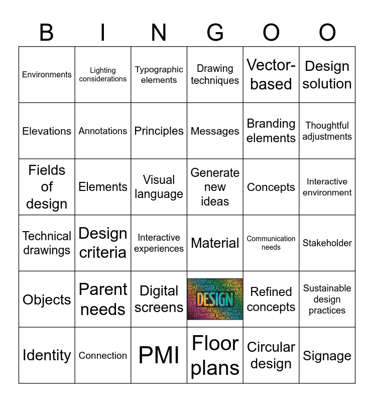 This bingo card has 1 images and 35 words: Digital screens, Floor plans, Elevations, Technical drawings, Generate new ideas, Annotations, PMI, Vector-based, Refined concepts, Thoughtful adjustments, Drawing techniques, Sustainable design practices, Elements, Messages, Environments, Objects, Concepts, Fields of design, Typographic elements, Visual language, Design criteria, Material, Interactive experiences, Communication needs, Lighting considerations, Branding elements, Connection, Principles, Design solution, Signage, Identity, Stakeholder, Interactive environment, Parent needs and Circular design.