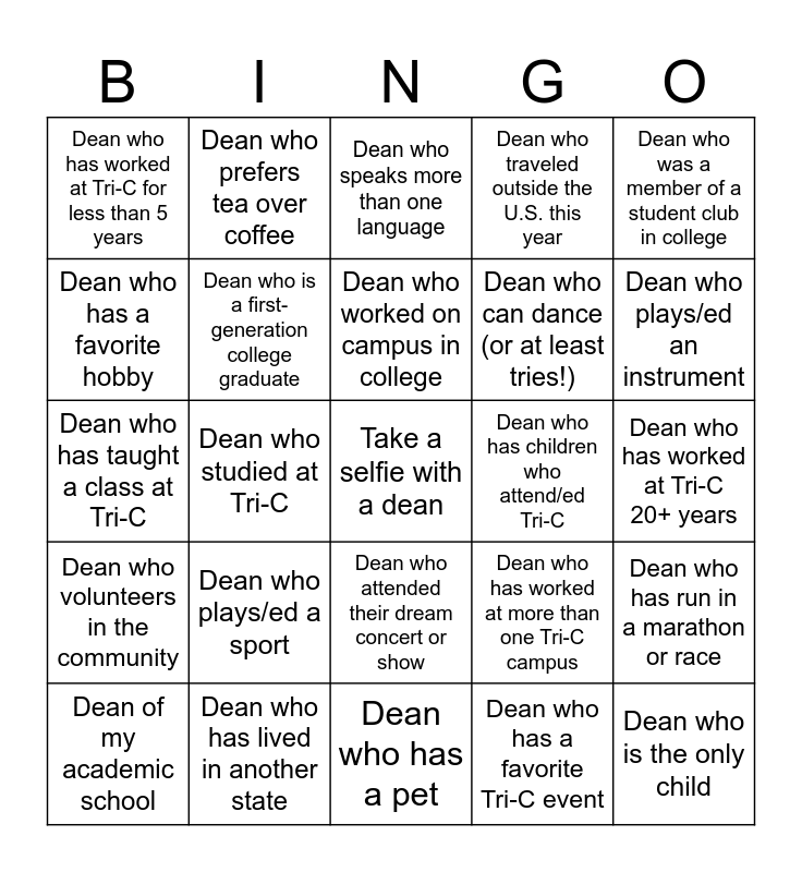 This bingo card has a free space and 29 words: Dean of my academic school, Dean who loves to travel, Dean who studied at Tri-C, Dean who has worked at Tri-C for 10+ years, Dean who has worked at Tri-C for less than 5 years, Dean who speaks more than one language, Dean who is a first-generation college graduate, Dean who plays/ed a sport, Dean who has children who attend/ed Tri-C, Dean who has lived in another state, Dean who has worked at Tri-C 20+ years, Dean who is the only child, Dean who has a pet, Dean who has a favorite Tri-C event, Dean who plays/ed an instrument, Dean who enjoys cooking or baking, Dean who attended their dream concert or show, Dean who volunteers in the community, Dean who was a member of a student club in college, Dean who has taught a class at Tri-C, Dean who has worked at more than one Tri-C campus, Dean who collects something (books, vinyl, memorabilia, etc.), Dean who can dance (or at least tries!), Dean who has a favorite hobby, Dean who traveled outside the U.S. this year, Dean who prefers tea over coffee, Dean who has run in a marathon or race, Dean who worked on campus in college and Dean who is wearing their school color.