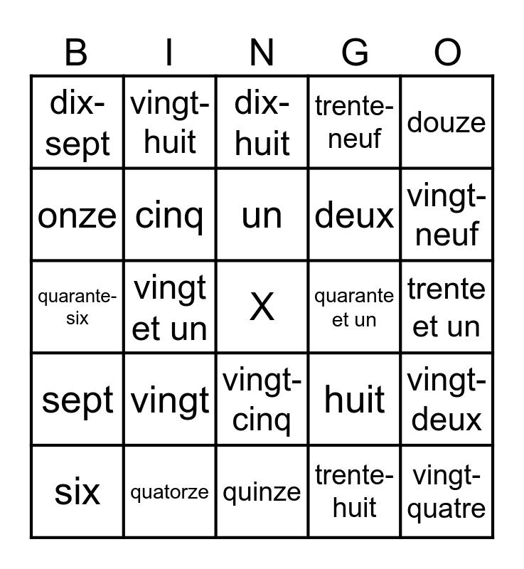 This bingo card has a free space and 51 words: zero, vingt-quatre, trois, quinze, vingt, treize, vingt-huit, quarante-huit, onze, trente-trois, cinq, trente-neuf, vingt-deux, huit, trente-quatre, quarante-neuf, un, quarante et un, cinquante, douze, vingt et un, trente-huit, dix-sept, deux, vingt-six, quatre, vingt-neuf, trente-sept, six, dix-huit, quarante- deux, quarante-quatre, dix, vingt-trois, trente-cinq, quatorze, trente, quarante, dix-neuf, quarante-sept, trente et un, sept, quarante-cinq, vingt-sept, neuf, trente-deux, quarante-six, trente-six, seize, vingt-cinq and quarante-trois.