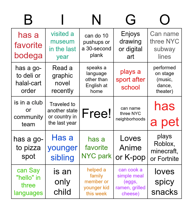 This bingo card has a free space and 24 words: Has a younger sibling, is an only child, speaks a language other than English at home, can Say "hello" in three languages, Can name three NYC subway lines, has a favorite bodega, has a go-to deli or halal-cart order, visited a museum in the last year, can name three NYC neighborhoods, has a favorite NYC park, plays a sport after school, is in a club or community team, Loves Anime or K-pop, plays Roblox, minecraft, or Fortnite, Read a graphic novel recently, can cook a simple meal (eggs, ramen, grilled cheese), has a pet, can do 10 pushups or a 30-second plank, performed on stage (music, dance, theater), Traveled to another state or country in the last year, loves spicy snacks, has a go-to pizza spot, Enjoys drawing or digital art and helped a family member or younger kid this week.