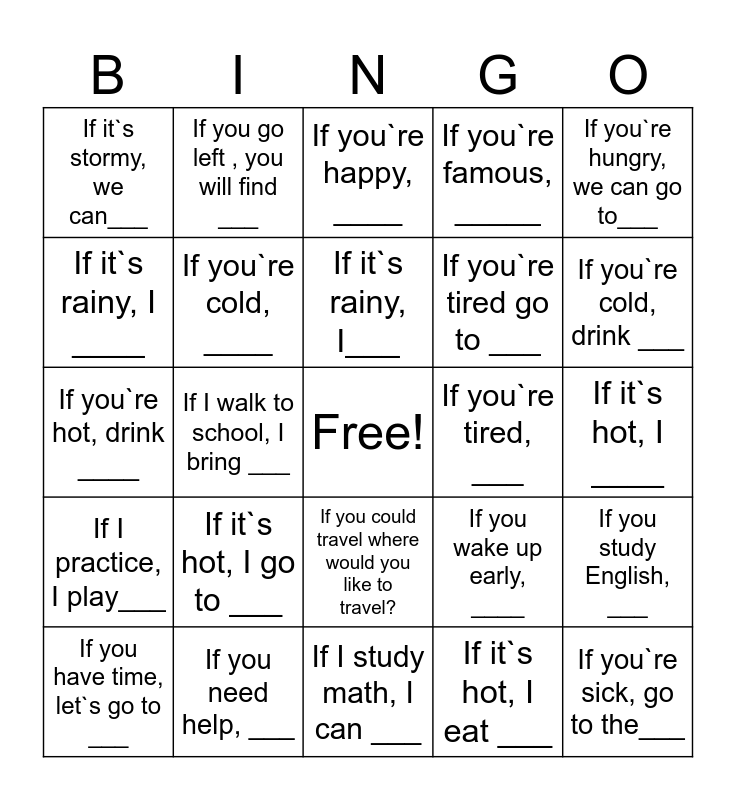 This bingo card has a free space and 24 words: If it`s hot, I go to ___, If you need help, ___, If it`s rainy, I___, If you have time, let`s go to ___, If you`re hungry, we can go to___, If it`s stormy, we can___, If it`s rainy, I ____, If you go left , you will find ___, If you`re tired, ___, If you could travel where would you like to travel?, If you`re tired go to ___, If you`re hot, drink ____, If you wake up early, ____, If you study English, ___, If you`re cold, ____, If it`s hot, I eat ___, If it`s hot, I ____, If you`re happy, ____, If you`re cold, drink ___, If I walk to school, I bring ___, If you`re sick, go to the___, If I practice, I play___, If you`re famous, _____ and If I study math, I can ___.