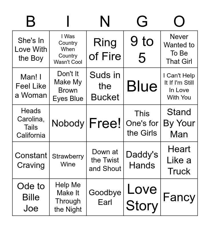 This bingo card has a free space and 50 words: Here For the Party, Fancy, Mama's Broken Heart, Goodbye Earl, Strawberry Wine, Coal Miner's Daughter, I Was Country When Country Wasn't Cool, Delta Dawn, Man! I Feel Like a Woman, Maybe It Was Memphis, Don't It Make My Brown Eyes Blue, 9 to 5, Heart Like a Truck, Daddy's Hands, Piece of my Heart, Follow Your Arrow, Suds in the Bucket, This One's for the Girls, Walkin' After Midnight, Never Wanted to To Be That Girl, Nobody, Love Story, She's In Love With the Boy, Blue, Timber, I'm Falling In Love, If I Could Only Win Your Love, I Can't Help It If I'm Still In Love With You, Love Me Like You Mean It, Ring of Fire, Down at the Twist and Shout, I Don't Want to Spoil the Party, My Church, It Wasn't God Who Made Honky Tonk Angels, I'll Fly Away, Help Me Make It Through the Night, I Hope You Dance, Angel in the Morning, Queen of Hearts, When You Say Nothing At All, Stand By Your Man, Tennessee Orange, Let Me Be There, Tennessee Waltz, Harper Valley PTA, Ode to Bille Joe, Heads Carolina, Tails California, Except for Monday, Girls Do It All the Time, Constant Craving and Mama He's Crazy.