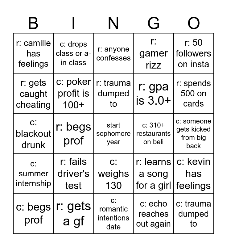 This bingo card has a free space and 24 words: r: fails driver's test, r: gets a gf, r: trauma dumped to, c: begs prof, r: 50 followers on insta, r: camille has feelings, r: gets caught cheating, c: drops class or a- in class, c: 310+ restaurants on beli, c: weighs 130, r: gpa is 3.0+, c: blackout drunk, r: learns a song for a girl, c: kevin has feelings, c: poker profit is 100+, c: echo reaches out again, c: someone gets kicked from big back, r: anyone confesses, r: spends 500 on cards, r: begs prof, c: trauma dumped to, c: summer internship, r: gamer rizz and c: romantic intentions date.