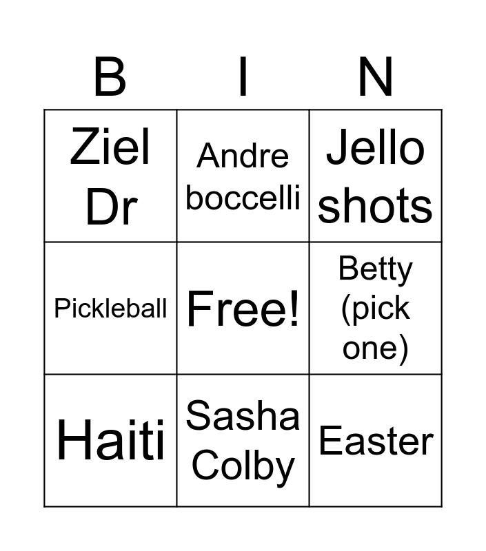 This bingo card has a free space and 33 words: Facebook, The grange, Promise ring, Proposal, RPDR, Haiti, Easter, 1st Christmas, Andre boccelli, Meeting mom, Sasha Colby, Jello shots, Unicorns, Zac, Nikki, Chewy, Diesel, Mckinley village - first house bought together, 3 months- time before moved, Unicorns, Androgony, Iris Ln, Ziel Dr, Range rover (crash), Smokey (garage), Hot tub, Pickleball, Ginger (meeting airport), Betty (pick one), Big Red, Push present, ...when the saints... and Donor pamphlet.