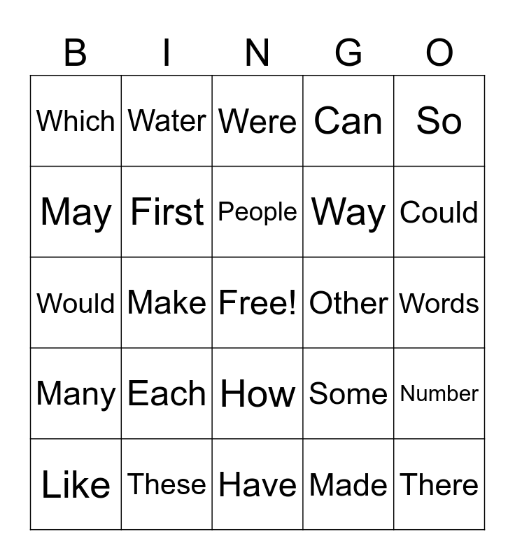 This bingo card has a free space and 24 words: Each, These, People, Like, So, Which, May, Water, Other, How, Way, Would, Some, Number, First, Made, Words, Were, Could, Make, There, Many, Can and Have.