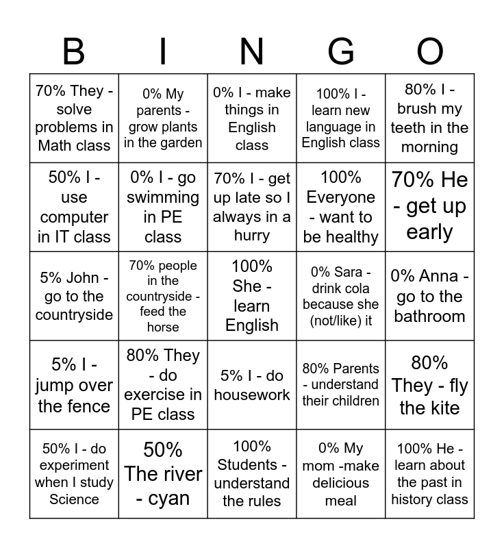 This bingo card has a free space and 24 words: 80% They - do exercise in PE class, 50% The river - cyan, 70% I - get up late so I always in a hurry, 50% I - do experiment when I study Science, 80% I - brush my teeth in the morning, 70% They - solve problems in Math class, 50% I - use computer in IT class, 0% My parents - grow plants in the garden, 0% Sara - drink cola because she (not/like) it, 5% I - do housework, 100% Everyone - want to be healthy, 5% John - go to the countryside, 80% Parents - understand their children, 80% They - fly the kite, 0% I - go swimming in PE class, 0% My mom -make delicious meal, 0% Anna - go to the bathroom, 0% I - make things in English class, 70% He - get up early, 70% people in the countryside - feed the horse, 100% He - learn about the past in history class, 5% I - jump over the fence, 100% I - learn new language in English class and 100% Students - understand the rules.