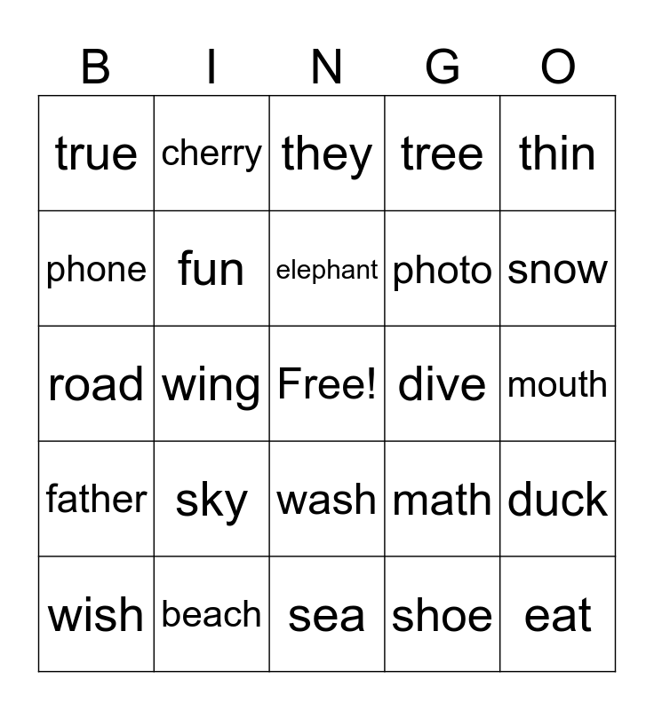 This bingo card has a free space and 44 words: ride, eat, fruit, wish, cry, shoe, they, window, thin, beach, tree, dive, wash, sky, dry, sea, sleep, road, brush, snow, cherry, tie, children, true, thank, mouth, bath, that, math, father, ring, duck, neck, sick, wing, rock, wheat, whale, elephant, phone, photo, five, fun and windy.