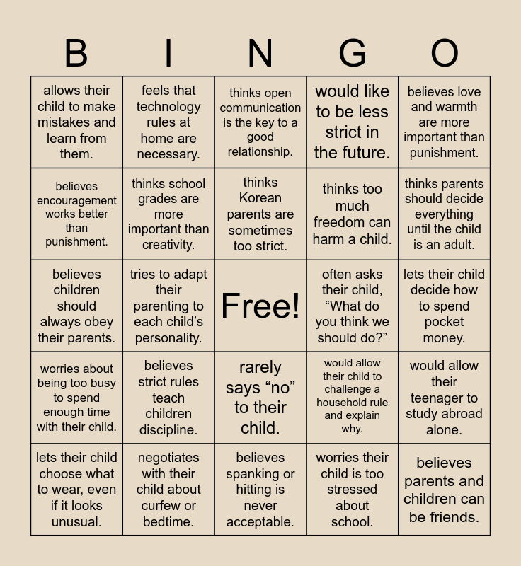 This bingo card has a free space and 41 words: sets clear rules but also listens to their child’s opinion., believes children should always obey their parents., lets their child choose their own hobbies and activities., thinks school grades are more important than creativity., negotiates with their child about curfew or bedtime., rarely says “no” to their child., thinks Korean parents are sometimes too strict., gives their child freedom only after rules are followed., believes love and warmth are more important than punishment., worries about being too busy to spend enough time with their child., tries to adapt their parenting to each child’s personality., would like to be less strict in the future., believes parents and children can be friends., lets their child decide how to spend pocket money., often asks their child, “What do you think we should do?”, believes strict rules teach children discipline., sometimes feels guilty for not spending enough time with their child., allows their child to make mistakes and learn from them., compares their parenting style to their own parents., thinks open communication is the key to a good relationship., would allow their teenager to study abroad alone., gives rewards or praise more often than punishment., believes spanking or hitting is never acceptable., thinks too much freedom can harm a child., wants their child to feel comfortable sharing secrets., sometimes changes rules when the child explains a good reason., worries their child is too stressed about school., prefers to use natural consequences instead of punishment., thinks parents should decide everything until the child is an adult., believes mutual respect is the most important value at home., tries to balance love, rules, and independence., feels that technology rules at home are necessary., lets their child choose what to wear, even if it looks unusual., believes sharing family meals is more important than strict study time., would allow their child to challenge a household rule and explain why., believes encouragement works better than punishment., sometimes changes house rules as the child grows older., thinks grades are less important than kindness., allows their child to invite friends over anytime., believes respect must go both ways between parent and child. and encourages their child to solve problems independently before helping..