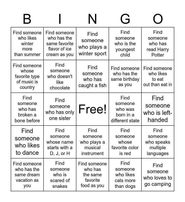 This bingo card has a free space and 24 words: Find someone whose name starts with a D, J, or H, Find someone who is scared of snakes, Find someone who has caught a fish, Find someone who has the same dream vacation as you, Find someone who has read Harry Potter, Find someone who likes winter more than summer, Find someone whose favorite type of music is country, Find someone who has the same favorite flavor of ice cream as you, Find someone who was born in a different state, Find someone who plays a musical instrument, Find someone who has the same birthday as you, Find someone who has broken a bone before, Find someone whose favorite color is red, Find someone who speaks multiple languages, Find someone who doesn't like chocolate, Find someone who likes cats more than dogs, Find someone who is left-handed, Find someone who plays a winter sport, Find someone who likes to eat out than eat in, Find someone who has only one sister, Find someone who loves to go camping, Find someone who likes to dance, Find someone who is the youngest child and Find someone who has the same favorite food as you.