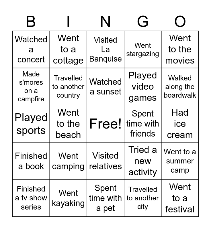 This bingo card has a free space and 24 words: Went camping, Went kayaking, Watched a sunset, Finished a tv show series, Went to the movies, Watched a concert, Made s'mores on a campfire, Went to a cottage, Spent time with friends, Visited relatives, Played video games, Played sports, Tried a new activity, Went to a summer camp, Travelled to another country, Travelled to another city, Had ice cream, Visited La Banquise, Walked along the boardwalk, Went to the beach, Went to a festival, Finished a book, Went stargazing and Spent time with a pet.