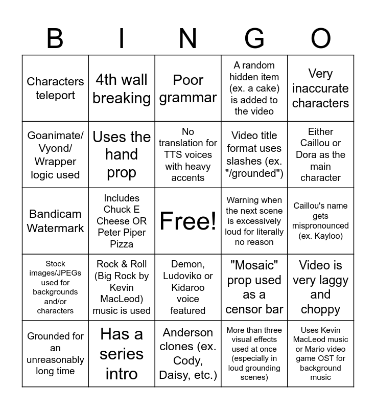 This bingo card has a free space and 24 words: Rock & Roll (Big Rock by Kevin MacLeod) music is used, Has a series intro, No translation for TTS voices with heavy accents, Grounded for an unreasonably long time, Very inaccurate characters, Characters teleport, Goanimate/ Vyond/ Wrapper logic used, 4th wall breaking, Warning when the next scene is excessively loud for literally no reason, Demon, Ludoviko or Kidaroo voice featured, Video title format uses slashes (ex. "/grounded"), Bandicam Watermark, "Mosaic" prop used as a censor bar, Video is very laggy and choppy, Uses the hand prop, More than three visual effects used at once (especially in loud grounding scenes), Caillou's name gets mispronounced (ex. Kayloo), Poor grammar, Either Caillou or Dora as the main character, Includes Chuck E Cheese OR Peter Piper Pizza, Uses Kevin MacLeod music or Mario video game OST for background music, Stock images/JPEGs used for backgrounds and/or characters, A random hidden item (ex. a cake) is added to the video and Anderson clones (ex. Cody, Daisy, etc.).