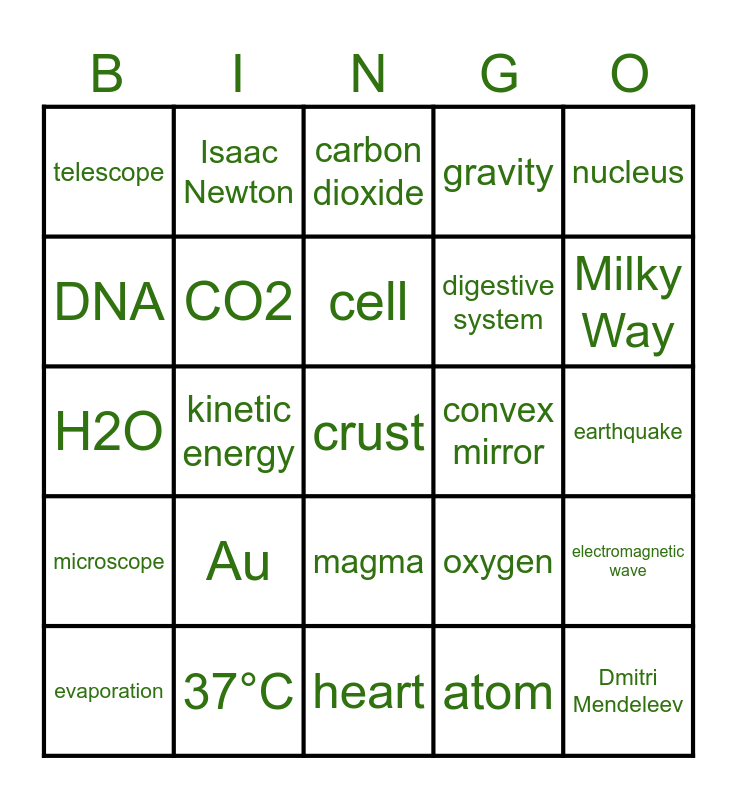 This bingo card has 25 words: Au, heart, cell, evaporation, nucleus, telescope, DNA, Isaac Newton, convex mirror, magma, digestive system, H2O, oxygen, electromagnetic wave, CO2, Dmitri Mendeleev, earthquake, carbon dioxide, Milky Way, kinetic energy, crust, 37°C, microscope, gravity and atom.