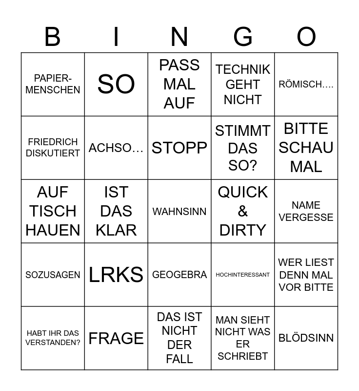 This bingo card has a free space and 24 words: LRKS, FRAGE, STOPP, HABT IHR DAS VERSTANDEN?, RÖMISCH…., PAPIER-MENSCHEN, FRIEDRICH DISKUTIERT, SO, QUICK & DIRTY, GEOGEBRA, STIMMT DAS SO?, AUF TISCH HAUEN, HOCHINTERESSANT, WER LIEST DENN MAL VOR BITTE, ACHSO…, MAN SIEHT NICHT WAS ER SCHRIEBT, NAME VERGESSE, PASS MAL AUF, BITTE SCHAU MAL, IST DAS KLAR, BLÖDSINN, SOZUSAGEN, TECHNIK GEHT NICHT and DAS IST NICHT DER FALL.