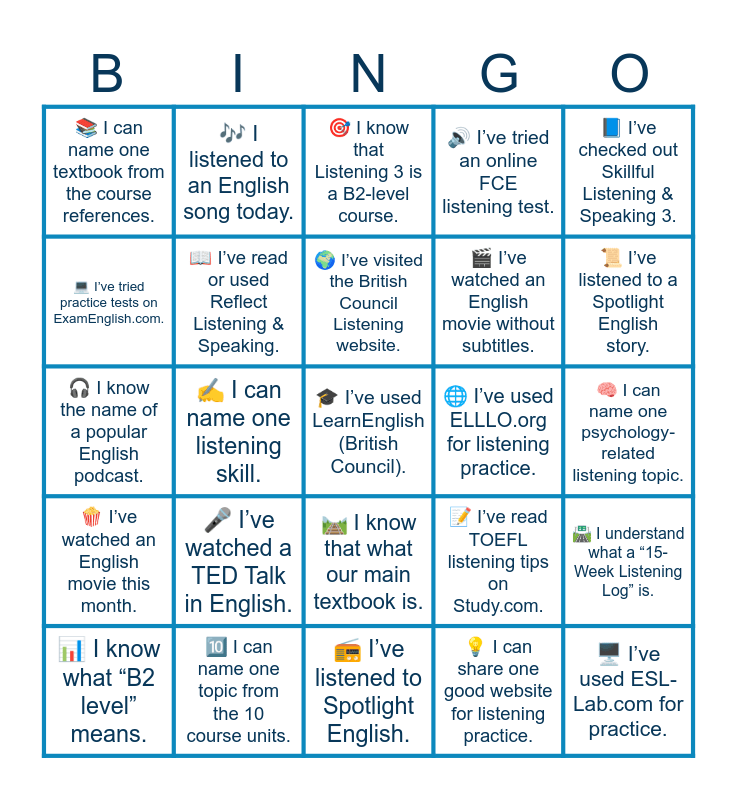 This bingo card has 25 words: ๐ค Iโve watched a TED Talk in English., ๐ป Iโve listened to Spotlight English., ๐ Iโve visited the British Council Listening website., ๐ I know what โB2 levelโ means., ๐ Iโve checked out Skillful Listening & Speaking 3., ๐ I can name one textbook from the course references., ๐ป Iโve tried practice tests on ExamEnglish.com., ๐ถ I listened to an English song today., ๐ Iโve used ELLLO.org for listening practice., ๐ค๏ธ I know that what our main textbook is., ๐ฌ Iโve watched an English movie without subtitles., ๐ง I know the name of a popular English podcast., ๐ Iโve read TOEFL listening tips on Study.com., ๐ฃ๏ธ I understand what a โ15-Week Listening Logโ is., ๐ Iโve read or used Reflect Listening & Speaking., ๐ฅ๏ธ Iโve used ESL-Lab.com for practice., ๐ง I can name one psychology-related listening topic., ๐ฏ I know that Listening 3 is a B2-level course., ๐ Iโve listened to a Spotlight English story., โ๏ธ I can name one listening skill., ๐ Iโve used LearnEnglish (British Council)., ๐ I can name one topic from the 10 course units., ๐ฟ Iโve watched an English movie this month., ๐ Iโve tried an online FCE listening test. and ๐ก I can share one good website for listening practice..