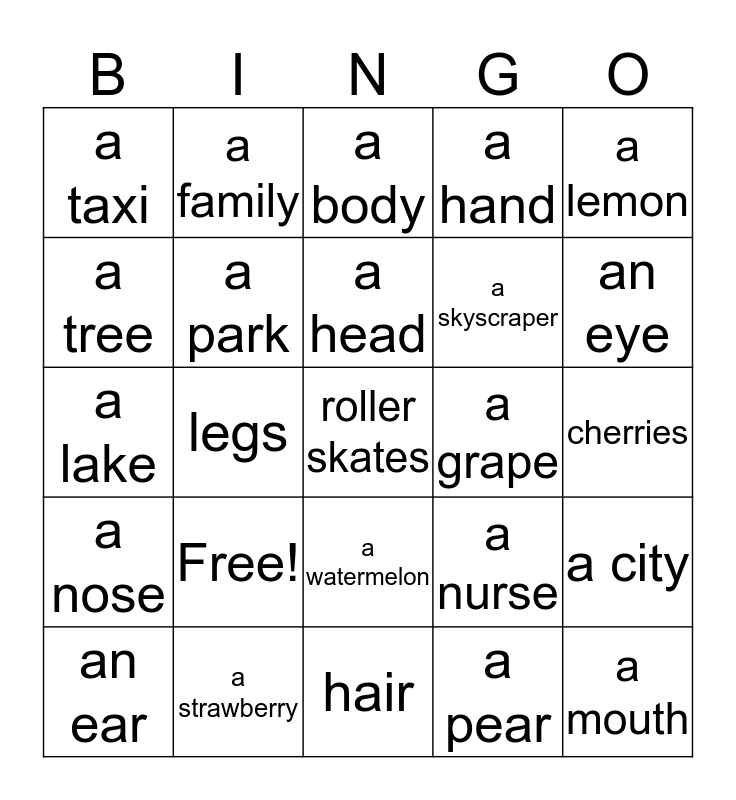 This bingo card has a free space and 24 words: Free!, a strawberry, a head, an ear, a lemon, a taxi, a tree, a family, a grape, a watermelon, a skyscraper, a lake, a nurse, a city, a park, a pear, cherries, a body, an eye, legs, a mouth, a nose, a hand and hair.