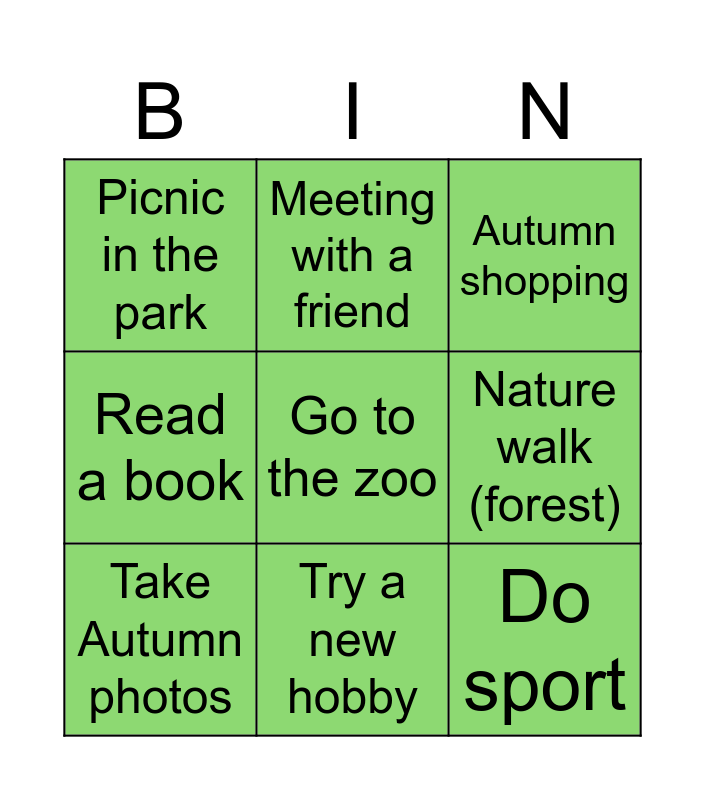 This bingo card has a free space and 8 words: Read a book, Meeting with a friend, Nature walk (forest), Take Autumn photos, Autumn shopping, Picnic in the park, Try a new hobby and Do sport.