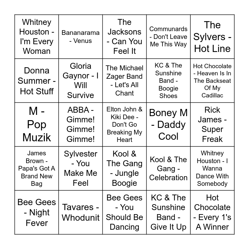 This bingo card has 40 words: Lionel Richie - All Night Long, M - Pop Muzik, Alicia Bridges - I Love The Nightlife, Gloria Gaynor - I Will Survive, Tavares - Whodunit, Kool & The Gang - Jungle Boogie, The Michael Zager Band - Let's All Chant, Eddie Money - Baby Hold On, The Sylvers - Hot Line, James Brown - Papa's Got A Brand New Bag, ABBA - Gimme! Gimme! Gimme!, Communards - Don't Leave Me This Way, Elton John & Kiki Dee - Don't Go Breaking My Heart, Rick James - Super Freak, Boney M - Daddy Cool, Sylvester - You Make Me Feel, Candi Staton - Young Hearts Run Free, Whitney Houston - I'm Every Woman, Womack & Womack - Teardrops, The Jacksons - Can You Feel It, Whitney Houston - I Wanna Dance With Somebody, KC & The Sunshine Band - Give It Up, KC & The Sunshine Band - Boogie Shoes, Donna Summer - Hot Stuff, Sinitta - Right Back Where We Started From, Labelle - Space Children, Boney M - Sunny, Bee Gees - Stayin' Alive, Hot Chocolate - Every 1's A Winner, Chic - Good Times, Village People - YMCA, Bee Gees - Night Fever, Emotions - Best Of My Love, Kool & The Gang - Celebration, Hot Chocolate - Heaven Is In The Backseat Of My Cadillac, Bee Gees - You Should Be Dancing, Kim Wilde - You Keep Me Hangin' On, Rolling Stones - Miss You, Bananarama - Venus and Donna Summer - Bad Girls.