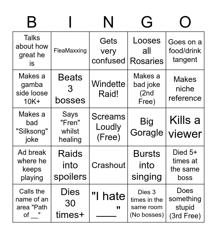 This bingo card has a free space and 24 words: Raids into spoilers, Dies 30 times+, Windette Raid!, Calls the name of an area "Path of __", Goes on a food/drink tangent, Talks about how great he is, Makes a gamba side loose 10K+, FleaMaxxing, Big Goragle, Crashout, Makes a bad joke (2nd Free), Makes a bad "Silksong" joke, Bursts into singing, Died 5+ times at the same boss, Beats 3 bosses, Dies 3 times in the same room (No bosses), Kills a viewer, Gets very confused, Makes niche reference, Says "Fren" whilst healing, Does something stupid (3rd Free), Ad break where he keeps playing, Looses all Rosaries and "I hate ___".