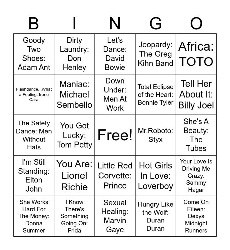 This bingo card has a free space and 45 words: Do You Really Want To Hurt Me: Culture Club, Come On Eileen: Dexys Midnight Runners, Shame On The Moon: Bob Seger, She Works Hard For The Money: Donna Summer, Never Gonna Let You Go: Sergio Mendes, Hungry Like the Wolf: Duran Duran, Let's Dance: David Bowie, Twilight Zone: Golden Earring, Africa: TOTO, I Know There's Something Going On: Frida, Jeopardy: The Greg Kihn Band, Mr.Roboto: Styx, Little Red Corvette: Prince, You Are: Lionel Richie, Puttin' on the Ritz: Taco, Sexual Healing: Marvin Gaye, Hey Mickey: Toni Basil, The Safety Dance: Men Without Hats, You Can't Hurry Love: Phil Collins, Tell Her About It: Billy Joel, Dirty Laundry: Don Henley, The Girl Is Mine: Michael Jackson, Too Shy: Kajagoogoo, Goody Two Shoes: Adam Ant, Our House: Madness, She's A Beauty: The Tubes, Come Dancing: The Kinks, Promises, Promises: Naked Eyes, Hot Girls In Love: Loverboy, I'm Still Standing: Elton John, Heart to Heart: Kenny Loggins, Your Love Is Driving Me Crazy: Sammy Hagar, Steppin' Out: Joe Jackson, Photograph: Def Leppard, Fall in Love with Me: Earth, Wind & Fire, You Got Lucky: Tom Petty, Don't Cry: Asia, Billie Jean: Michael Jackson, Every Breath You Take: The Police, Down Under: Men At Work, Flashdance...What a Feeling: Irene Cara, Total Eclipse of the Heart: Bonnie Tyler, Maneater: Daryl Hall, Maniac: Michael Sembello and Sweet Dreams: Eurythmics.
