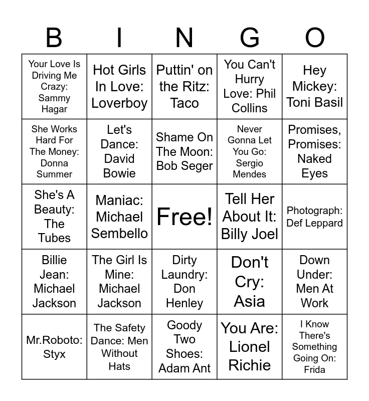 This bingo card has a free space and 45 words: Africa: TOTO, I Know There's Something Going On: Frida, Jeopardy: The Greg Kihn Band, Mr.Roboto: Styx, Little Red Corvette: Prince, You Are: Lionel Richie, Puttin' on the Ritz: Taco, Sexual Healing: Marvin Gaye, Hey Mickey: Toni Basil, The Safety Dance: Men Without Hats, You Can't Hurry Love: Phil Collins, Tell Her About It: Billy Joel, Dirty Laundry: Don Henley, The Girl Is Mine: Michael Jackson, Too Shy: Kajagoogoo, Goody Two Shoes: Adam Ant, Our House: Madness, She's A Beauty: The Tubes, Come Dancing: The Kinks, Promises, Promises: Naked Eyes, Hot Girls In Love: Loverboy, I'm Still Standing: Elton John, Heart to Heart: Kenny Loggins, Your Love Is Driving Me Crazy: Sammy Hagar, Steppin' Out: Joe Jackson, Photograph: Def Leppard, Fall in Love with Me: Earth, Wind & Fire, You Got Lucky: Tom Petty, Don't Cry: Asia, Billie Jean: Michael Jackson, Every Breath You Take: The Police, Down Under: Men At Work, Flashdance...What a Feeling: Irene Cara, Total Eclipse of the Heart: Bonnie Tyler, Maneater: Daryl Hall, Maniac: Michael Sembello, Sweet Dreams: Eurythmics, Do You Really Want To Hurt Me: Culture Club, Come On Eileen: Dexys Midnight Runners, Shame On The Moon: Bob Seger, She Works Hard For The Money: Donna Summer, Never Gonna Let You Go: Sergio Mendes, Hungry Like the Wolf: Duran Duran, Let's Dance: David Bowie and Twilight Zone: Golden Earring.