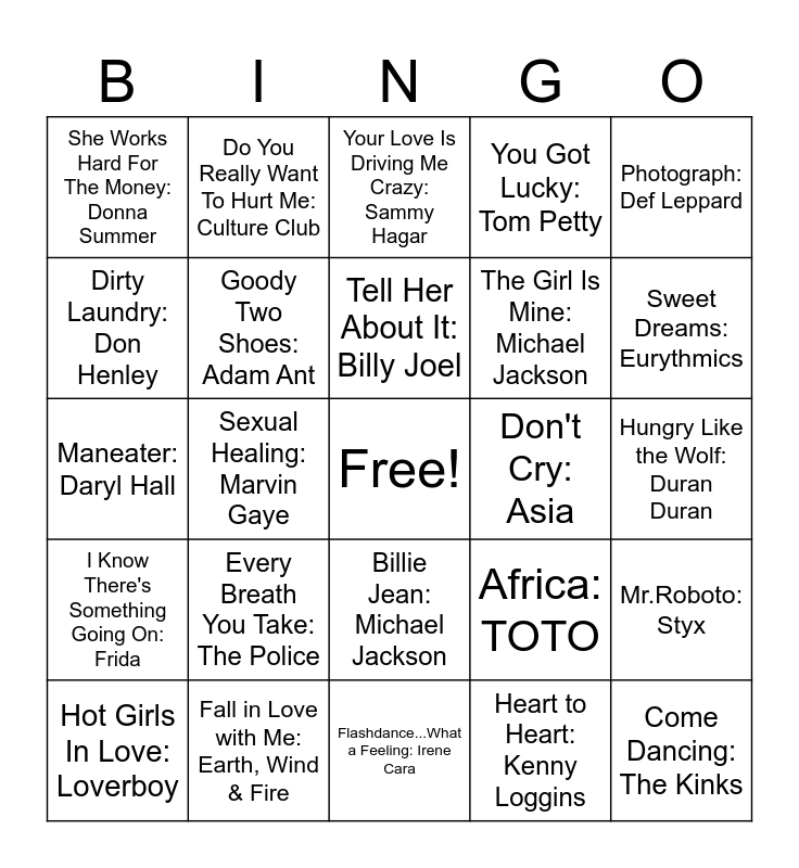 This bingo card has a free space and 45 words: She's A Beauty: The Tubes, Come Dancing: The Kinks, Promises, Promises: Naked Eyes, Hot Girls In Love: Loverboy, I'm Still Standing: Elton John, Heart to Heart: Kenny Loggins, Your Love Is Driving Me Crazy: Sammy Hagar, Steppin' Out: Joe Jackson, Photograph: Def Leppard, Fall in Love with Me: Earth, Wind & Fire, You Got Lucky: Tom Petty, Don't Cry: Asia, Billie Jean: Michael Jackson, Every Breath You Take: The Police, Down Under: Men At Work, Flashdance...What a Feeling: Irene Cara, Total Eclipse of the Heart: Bonnie Tyler, Maneater: Daryl Hall, Maniac: Michael Sembello, Sweet Dreams: Eurythmics, Do You Really Want To Hurt Me: Culture Club, Come On Eileen: Dexys Midnight Runners, Shame On The Moon: Bob Seger, She Works Hard For The Money: Donna Summer, Never Gonna Let You Go: Sergio Mendes, Hungry Like the Wolf: Duran Duran, Let's Dance: David Bowie, Twilight Zone: Golden Earring, Africa: TOTO, I Know There's Something Going On: Frida, Jeopardy: The Greg Kihn Band, Mr.Roboto: Styx, Little Red Corvette: Prince, You Are: Lionel Richie, Puttin' on the Ritz: Taco, Sexual Healing: Marvin Gaye, Hey Mickey: Toni Basil, The Safety Dance: Men Without Hats, You Can't Hurry Love: Phil Collins, Tell Her About It: Billy Joel, Dirty Laundry: Don Henley, The Girl Is Mine: Michael Jackson, Too Shy: Kajagoogoo, Goody Two Shoes: Adam Ant and Our House: Madness.