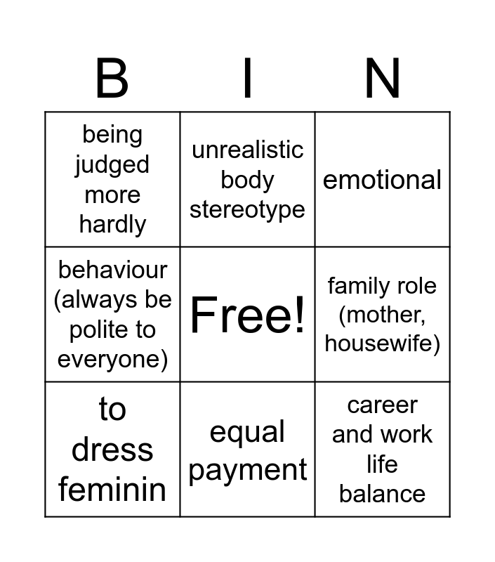 This bingo card has a free space and 8 words: family role (mother, housewife), emotional, unrealistic body stereotype, to dress feminin, being judged more hardly, career and work life balance, behaviour (always be polite to everyone) and equal payment.