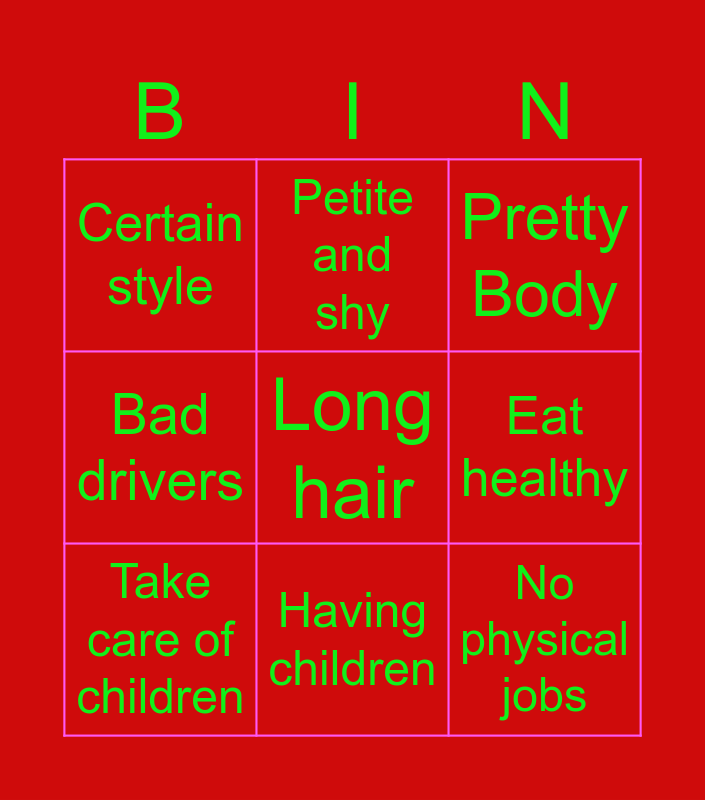 This bingo card has a free space and 8 words: Eat healthy, Pretty Body, Petite and shy, Take care of children, Certain style, No physical jobs, Bad drivers and Having children.