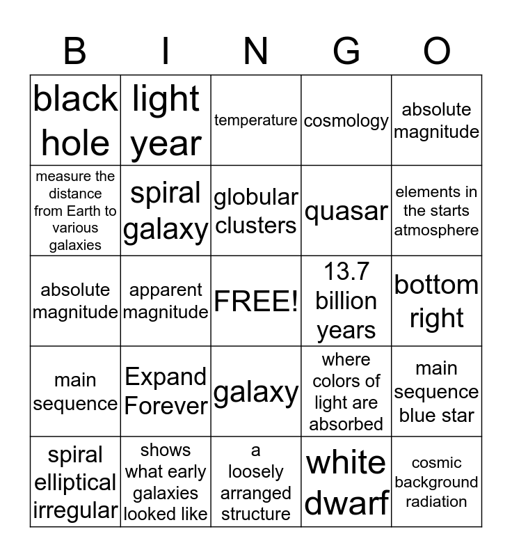 This bingo card has a free space and 24 words: Expand Forever, shows what early galaxies looked like, globular clusters, spiral elliptical irregular, absolute magnitude, black hole, measure the distance from Earth to various galaxies, light year, 13.7 billion years, galaxy, quasar, absolute magnitude, where colors of light are absorbed, main sequence blue star, spiral galaxy, white dwarf, bottom right, temperature, elements in the starts atmosphere, apparent magnitude, cosmic background radiation, main sequence, cosmology and a loosely arranged structure.